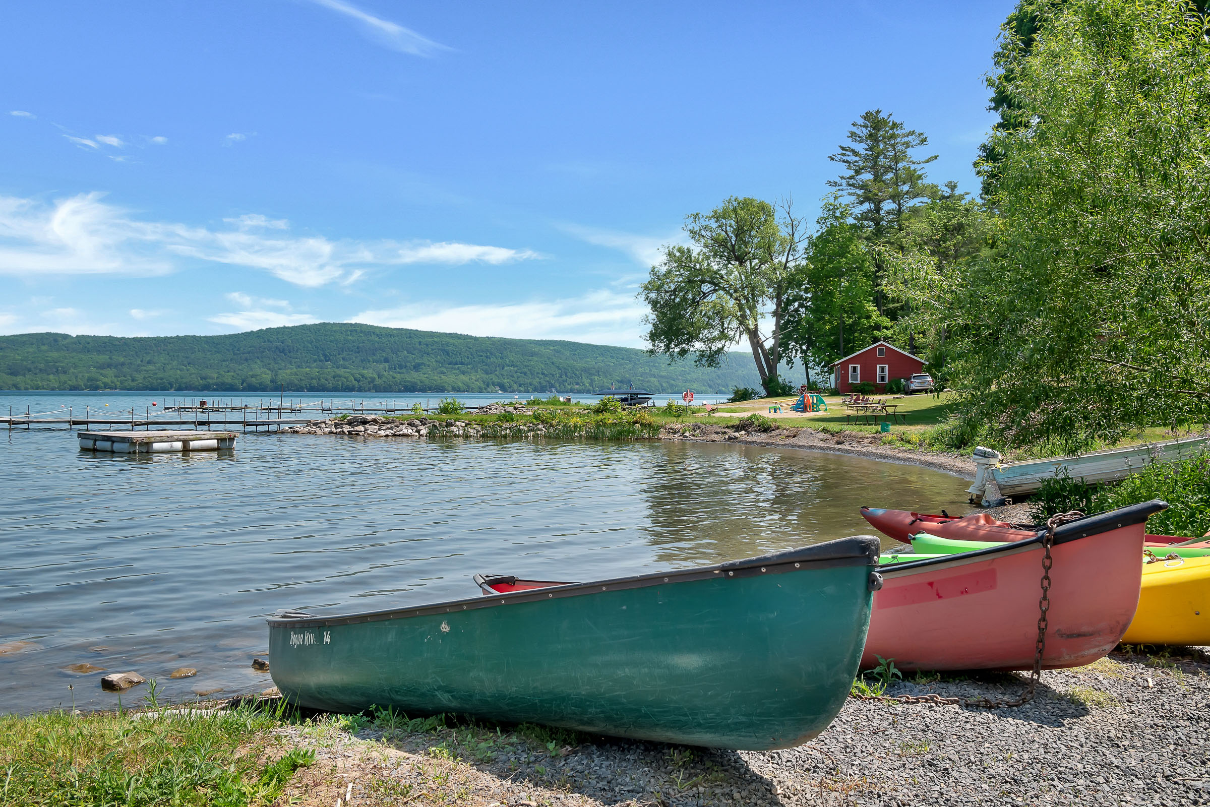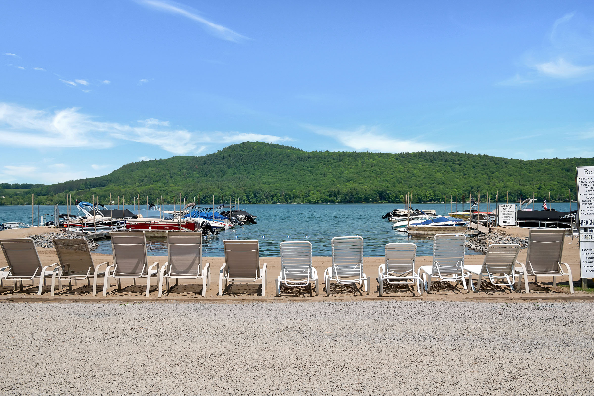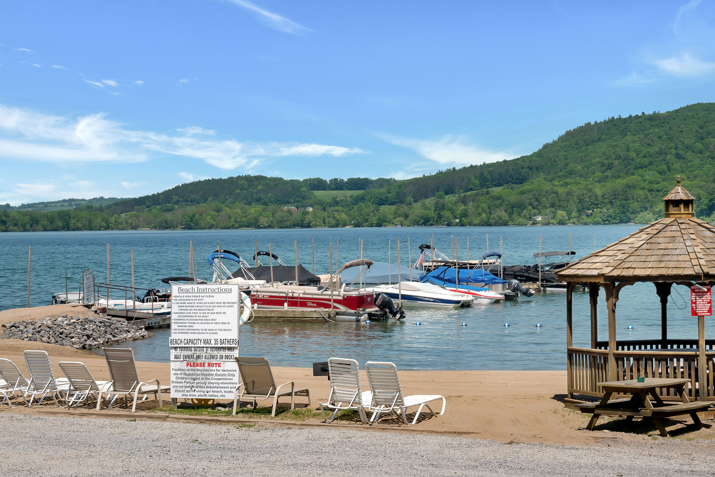 Swimming, boating, picnicking, barbecuing, or just sunbathing and reading a good book - they're all available at our lovely private waterfront on Otsego Lake. Our sandy beach measures approximately 60 feet long. The width of the beach and size and depth of the swimming area varies based on the amount of rainfall during the season. The swimming area is a roped off shallow area safe for children of all ages. If your family or group needs more space Glimmerglass State Park is just a short drive away.